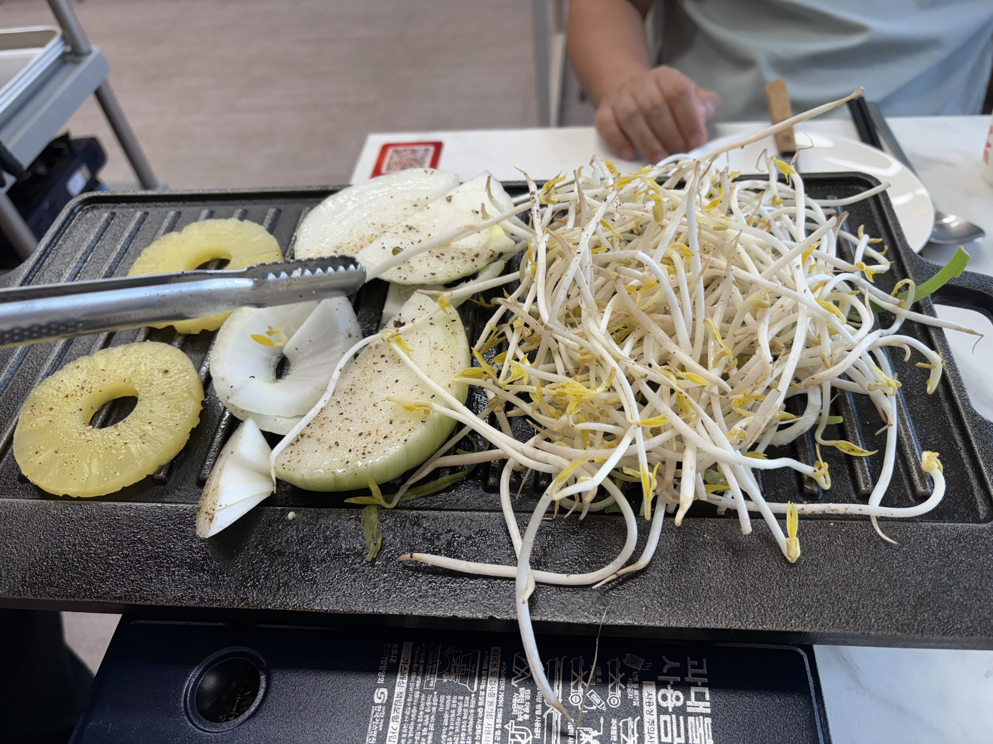 스테이크는 사장님께서 직접 익혀주시는데, 처음에는 파인애플, 양파, 콩나물을 먼저 볶다가 어느 정도 익으면, 그 위에 스테이크를 구워주셨어요. 그리고 먹기 좋게 맛있게 잘라 주셨답니다.