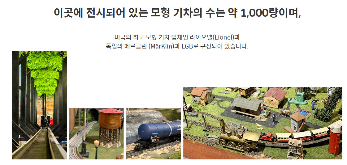 기차를 테마로 한 공간인데, 미니어처 기차 세트가 정말 정교해요. 철도 마니아가 아니더라도 충분히 재미있게 볼 수 있습니다.