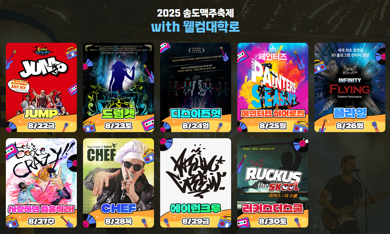 매년 송도맥주축제는 다양한 장르의 음악 공연을 선보여 왔습니다: