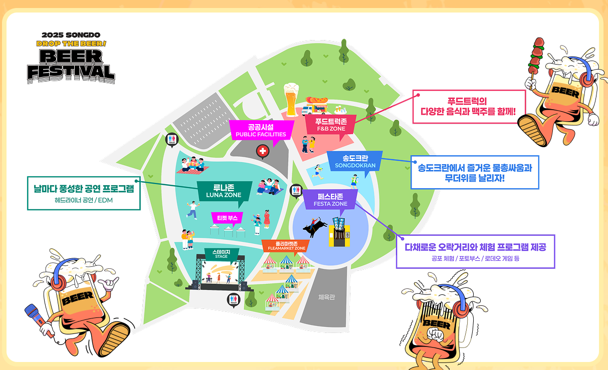 축제 문의: songdobeer@ifm.kr 공식 홈페이지: songdobeer.com 운영 시간: 평일 10:00 - 17:00 (점심시간 12:00 - 13:00)