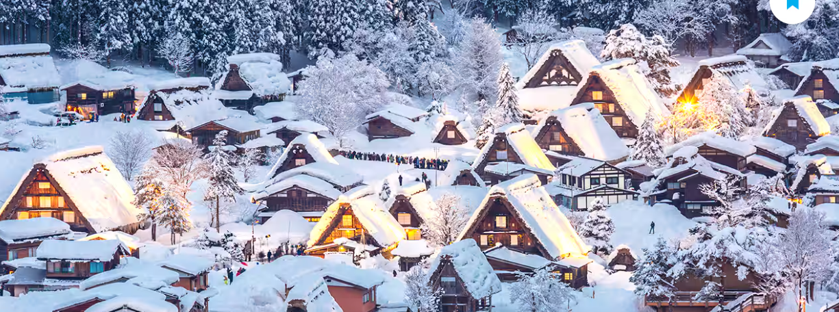 나가노와 기후현 경계에 위치한 시라카와고는 세계문화유산으로 지정된 갓쇼즈쿠리(합장 양식) 가옥이 보존된 마을입니다. 눈이 쌓인 갓쇼즈쿠리 지붕은 마치 동화책에서 튀어나온 듯한 풍경을 연출합니다.