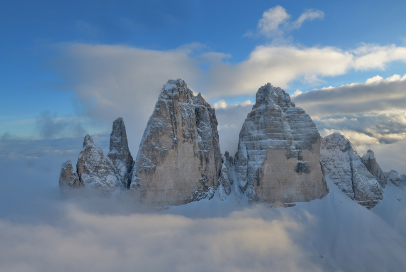 이탈리아 알프스 돌로미티: 구름 위로 솟은 트레치메 봉우리들. 가족 휴양지로도 유명하다.