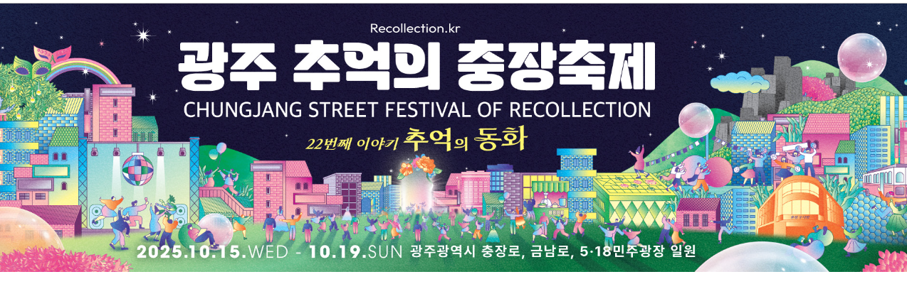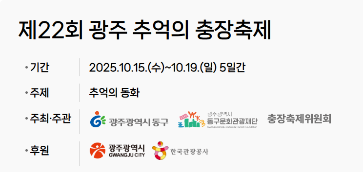 가을마다 광주 도심을 뜨겁게 달구는 광주 추억의 충장축제가 올해도 돌아왔습니다! 제22회를 맞이하는 이번 축제는 '추억의 동화'를 주제로 10월 15일부터 19일까지 닷새간 금남로와 충장로 일대를 환상의 세계로 만들어냅니다. 문화체육관광부가 지정한 대한민국 명예문화관광축제이자, 세계축제협회(IFEA)가 인정한 '세계축제도시' 광주의 대표 축제를 지금 소개합니다.