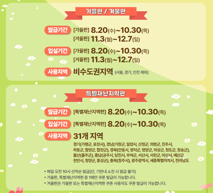 중요한 점은 가을편과 특별재난지역편 중에서는 1매만 발급이 가능하다는 것입니다. 하지만 겨울편은 별도로 발급받을 수 있어서, 총 최대 2매까지 사용할 수 있어요!